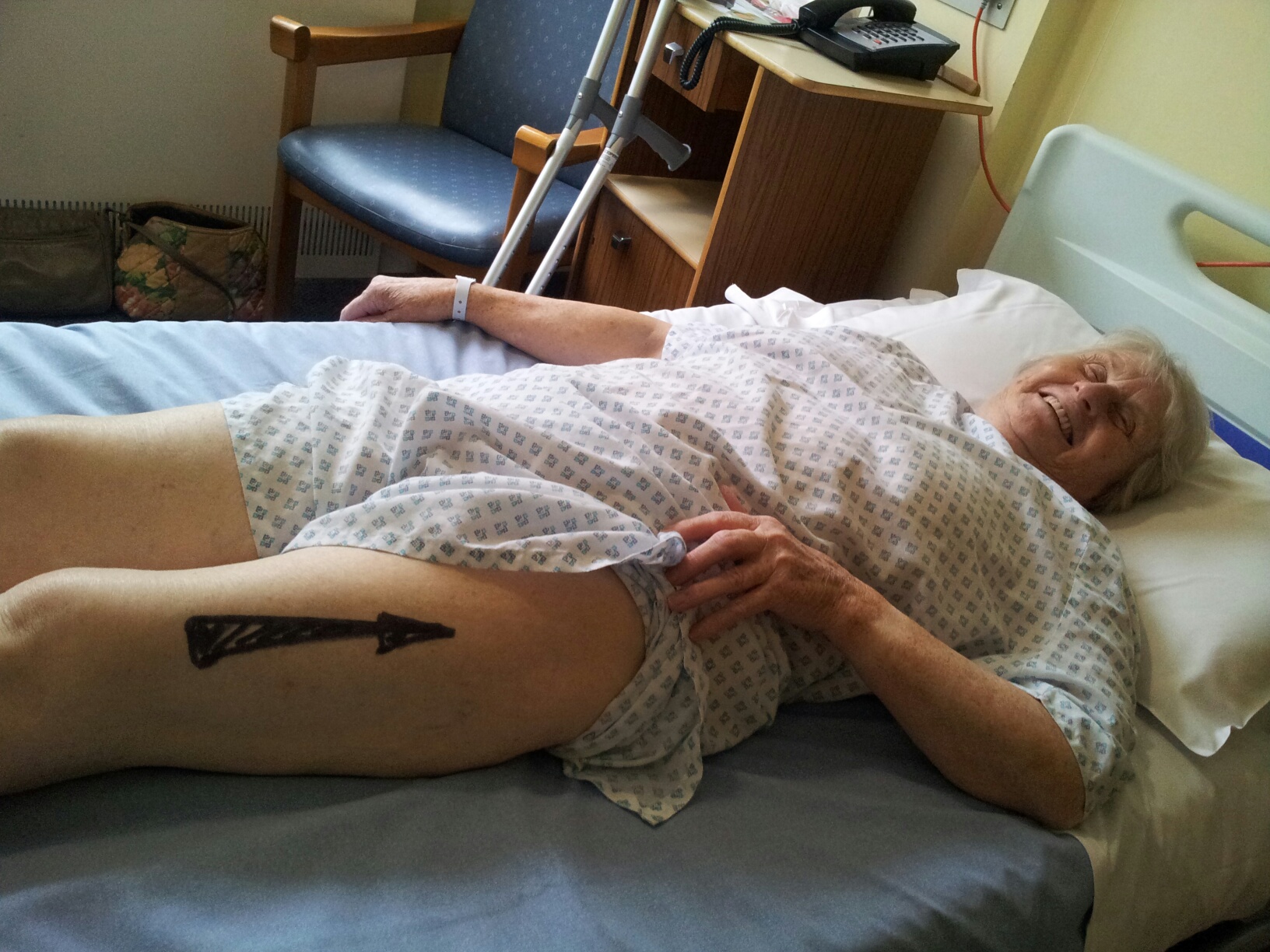 Before being wheeled down to the theatre Mum had a huge black arrow drawn on her leg in permanent marker. So unlike the pacemaker fitting, I didn’t have to go down to the operating theatre with her to check that they were going to do the correct operation!